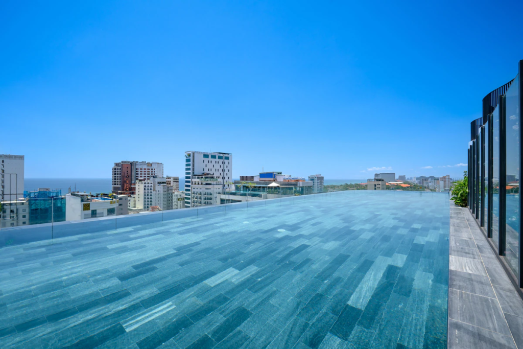 Rooms are comfortable and elegantly furnished, with large windows that allow guests to enjoy the beach views without compromising on privacy. The hotel’s public spaces, including its rooftop bar and outdoor pool, provide sweeping views of the coast, making it an excellent spot for guests to relax, enjoy a drink, and soak in the beach atmosphere.